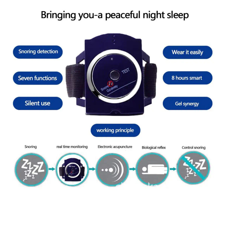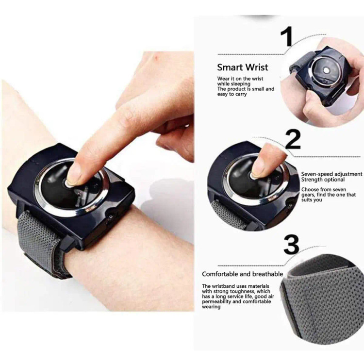 دستگاه ضد خروپف دکتر اسلیپ یک ابزار کاربردی برای از بین بردن خروپف شما در هنگام خواب است. این دستگاه که شمایلی مانند یک ساعت مچی دارد، به مچ شما بسته شده و با تنظیم آن می توانید آن را راه اندازی کنید. برای تنظیم این دستگاه کافی است شستی نقره ای وسط آن را چند ثانیه نگه دارید و صدای خروپف خود را ضبط کنید تا دستگاه بتواند نمونه صدای خروپف شما را در حافظه خود ثبت کند. سپس دکمه را رها کنید و اکنون دستگاه شما آماده استفاده است. دو عدد پد سیلیکونی که در بسته بندی موجود است را پشت مچ بند بچسبانید و درجه دستگاه را توسط شستی های مشکی رنگ تنظیم کنید. بعد از این کار، مچ بند را ببندید و بخوابید. اگر در هنگام خواب خروپف کنید، بعد از 5 ثانیه مچ بند فعال می شود و از طریق پدهای سیلیکونی پشت آن، شوک خفیفی به شما می دهد و باعث می شود خواب شما سبک شده و خودتان را جابجا کنید. بنابراین دیگر خروپف نمی کنید و دیگران کنار شما خواب آرامی خواهند داشت. این محصول یک ابزار کاربردی و آرام بخش در همه خانه ها است. در داخل بسته بندی آن، دو عدد پد، یک دفترچه راهنما و یک پیچ گشتی کوچک برای باز کردن درب باتری قرار داده شده است. یک عدد باتری نیم قلمی برای منبع تغذیه این دستگاه استفاده می شود و داخل بسته بندی قرار دارد.
