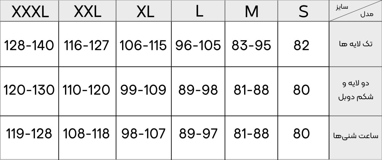 - سایزبندی: برای تعیین سایز از روی جدول اقدام نمایید