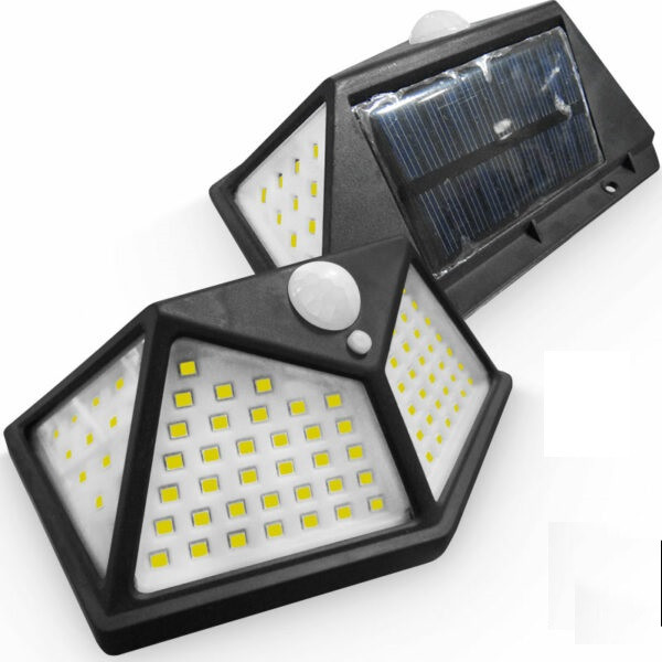 چراغ خورشیدی دیواری SMD (100 ال ای دی) چهار وجهی مجهز به سنسور برای روشن شدن اتوماتیک در شب و سنسور حرکتی مادون قرمز است.