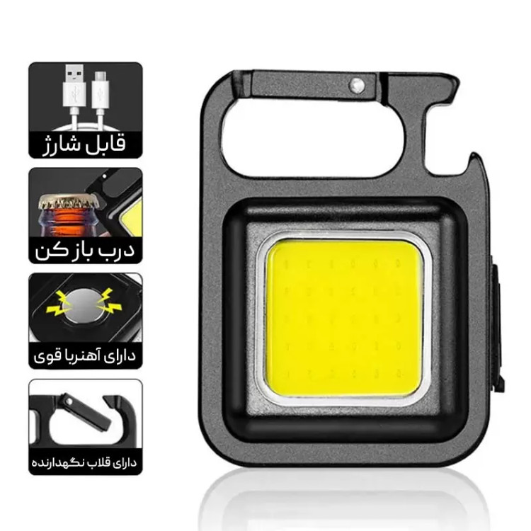 - جنس آلیاژ بدنه چراغ قوه مگنتی آلومینیوم است که در برابر ضربه مقاوم است. برای شارژ آن کافی است از کابل شارژ type C که به همراه چراغ قوه قرار دارد، استفاده کنید. هم چنین از چراغ قوه مگنتی می توان به عنوان دربازکن و جا کلیدی هم استفاده نمود. یکی از ویژگی های اصلی دسته کلید چندکاره cob، دارا بودن قابلیت شارژ با برق شهری با یک کابل قابل اتصال micro USB در قسمت جلویی این محصول است که یک چراغ cob در آن به کار رفته است و باید حدودا یک ساعت و نیم شارژ شود این دست کلید cob می تواند در حالت پرنور تا 2 ساعت و درحالت نور متوسط تا 4 ساعت و درحالت کم نور تا 7 ساعت قابل نوردهی و روشنایی داشته باشد.لازم به ذکر است که این وسیله کوچک سه حالت نوردهی از جمله :چشمک زن ،اضطراری و ثابت دارد. همچنین در قسمت پشتی چراغ کار مینی چندکاره مگنتی COB مدل LED KEYCHAIN LIGHT، پایه نگهدارنده متحرک 180 درجه است، که میتواند در زاویه های مختلف استفاده کرد.