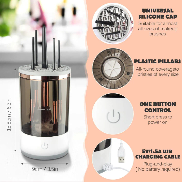 در پایه پاک کننده برس آرایشی، موتور پرسرعت یک چرخشی را ایجاد می کند. گرداب سریع آب برای پاکسازی عمیق و ملایم بر اساس ارتعاشات صوتی، به راحتی بقایای کثیف را از بین می برد در حالی که از موهای برس های آرایشی شما در برابر آسیب محافظت می کند. وسیله ای نه تنها برای تمیز کردن برس ها بلکه می تواند خشک کن و وسیله ای برای نگهداری برس ها باشد.
