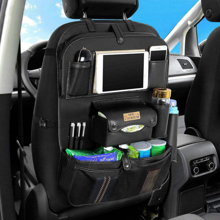 کیف پشت صندلی چرم محصولی با طراحی شیک، زیبا و جادار برای نگهداری لوازم بسیاری مانند بطری آب و نوشابه،تبلت ، گوشی موبایل، کتاب، خودکار، لیوان و مانند آنها می باشد که همگی آنها اکثر مواقع در زمان های مسافرت و گردش خانوادگی مورد استفاده بوده و می تواند با عدم وجود یک نظم دهنده باعث به هم ریختگی داخل خودرو و کمبود جای کافی در داخل ماشین باشد.