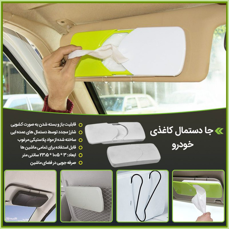 جا دستمال کاغذی ماشین محصولی با طراحی نوین و بسیار کاربردی که می توان گفت بزرگترین ویژگی آن، امکان به کارگیری فضای غیر قابل استفاده درون ماشین و همچنین ثابت ماندن جا دستمال کاغذی در حین حرکت ماشین و تکان های ناشی از آن می باشد.در قسمت پشت جا دستمال کاغذی، گیره ای تعبیه شده که به شما امکان نصب آن را بر روی سایه بان ماشین (آفتابگیر) را می دهد و نیازی به اشغال فضای زیاد داخل ماشین ندارد. جا دستمال کاغذی ماشین از جنس پلاستیک مرغوب تهیه گردیده و درب آن نیز به صورت کشویی باز و بسته می شود که شما بعد از هر بار استفاده می توانید درب آن را ببندید.