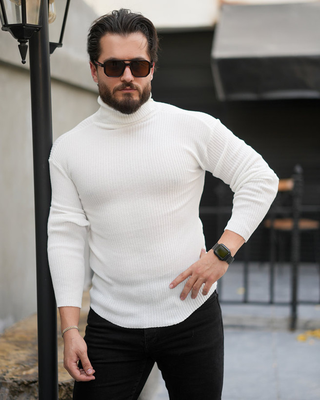 بافت مردانه یقه اسکی کشی ( سفید) کد SAB6428