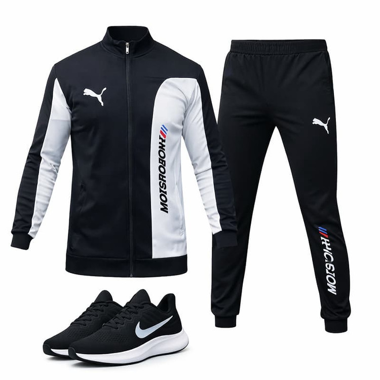 ست سویشرت شلوار مدل MotorSport و کفش مردانه Nike مدل Tigo زیره سفید