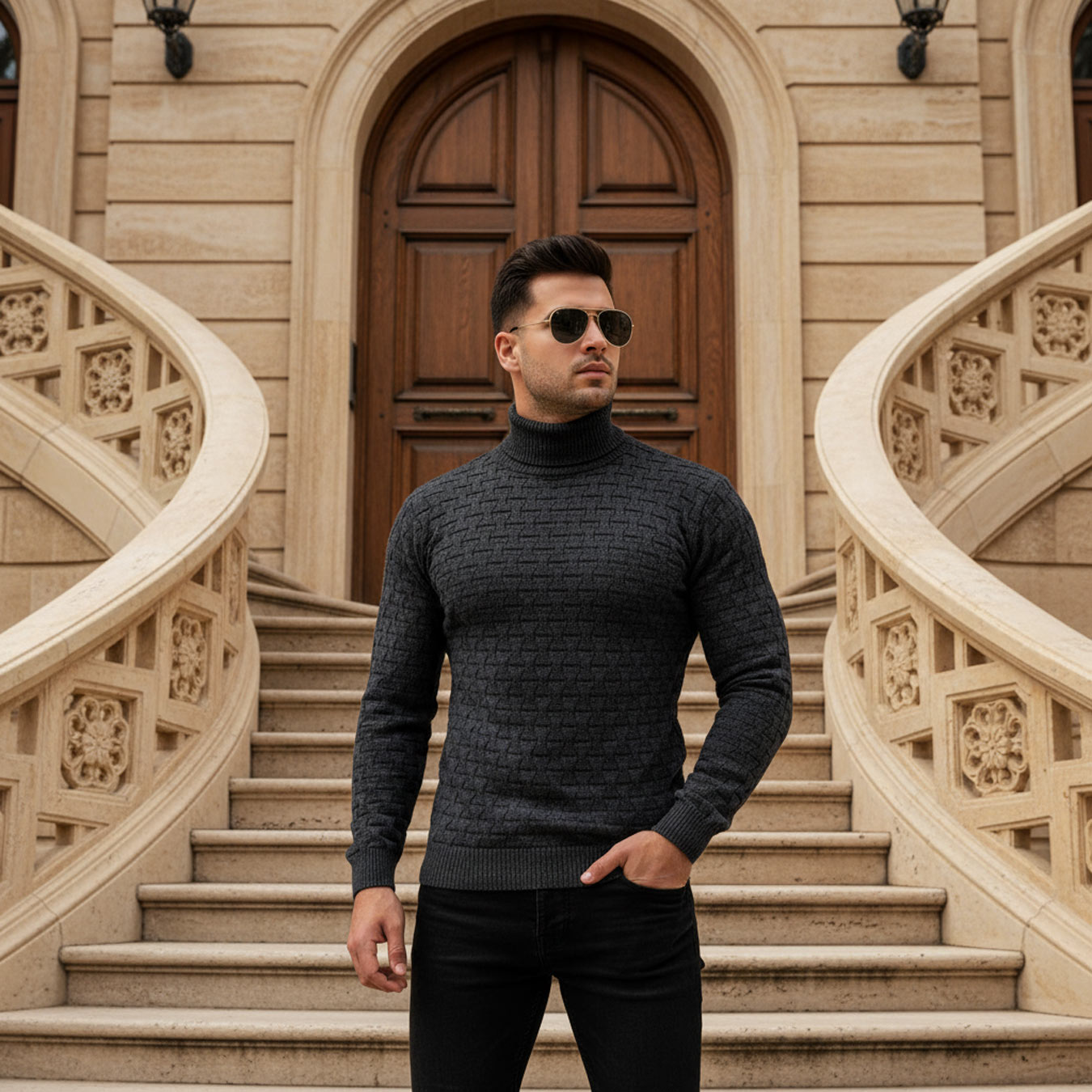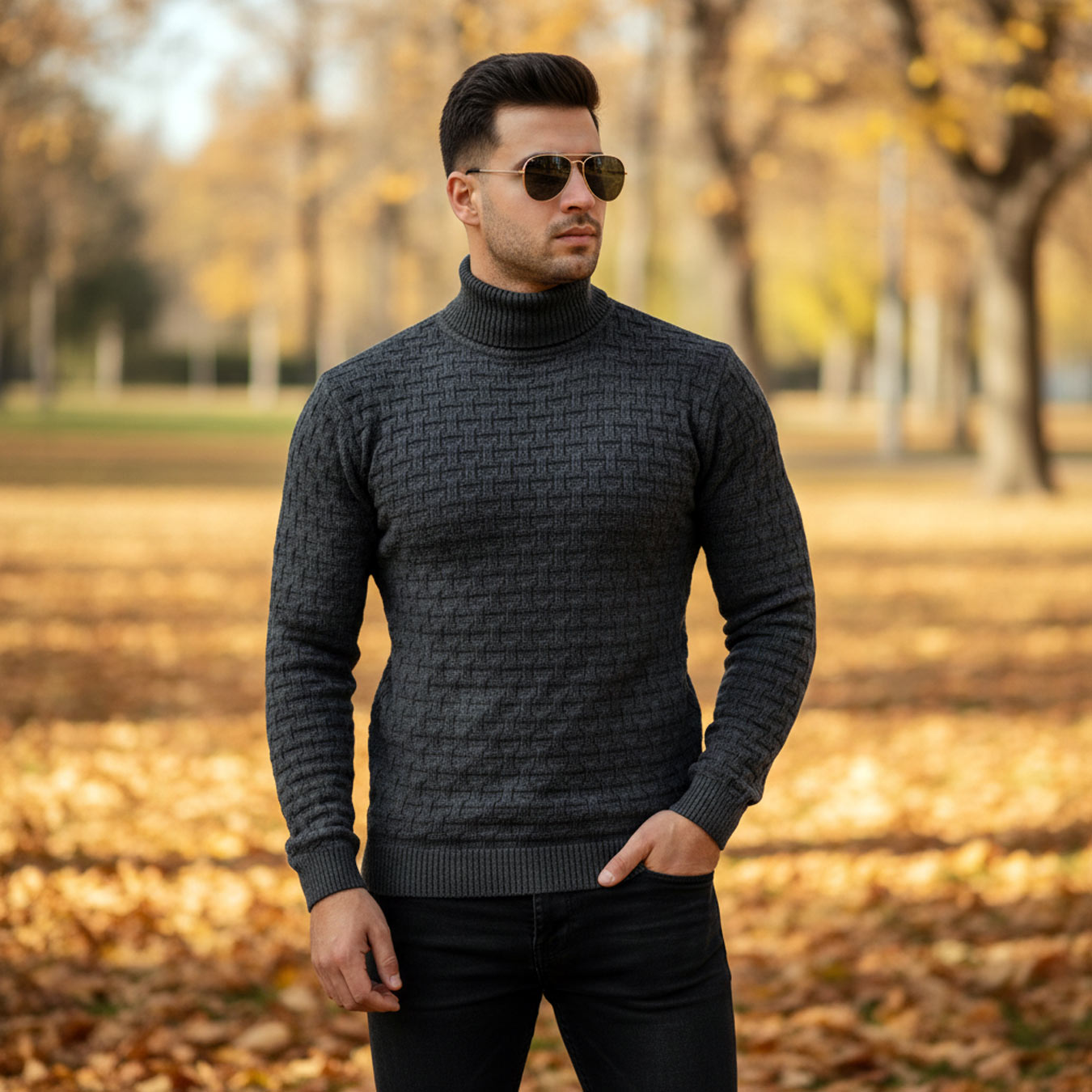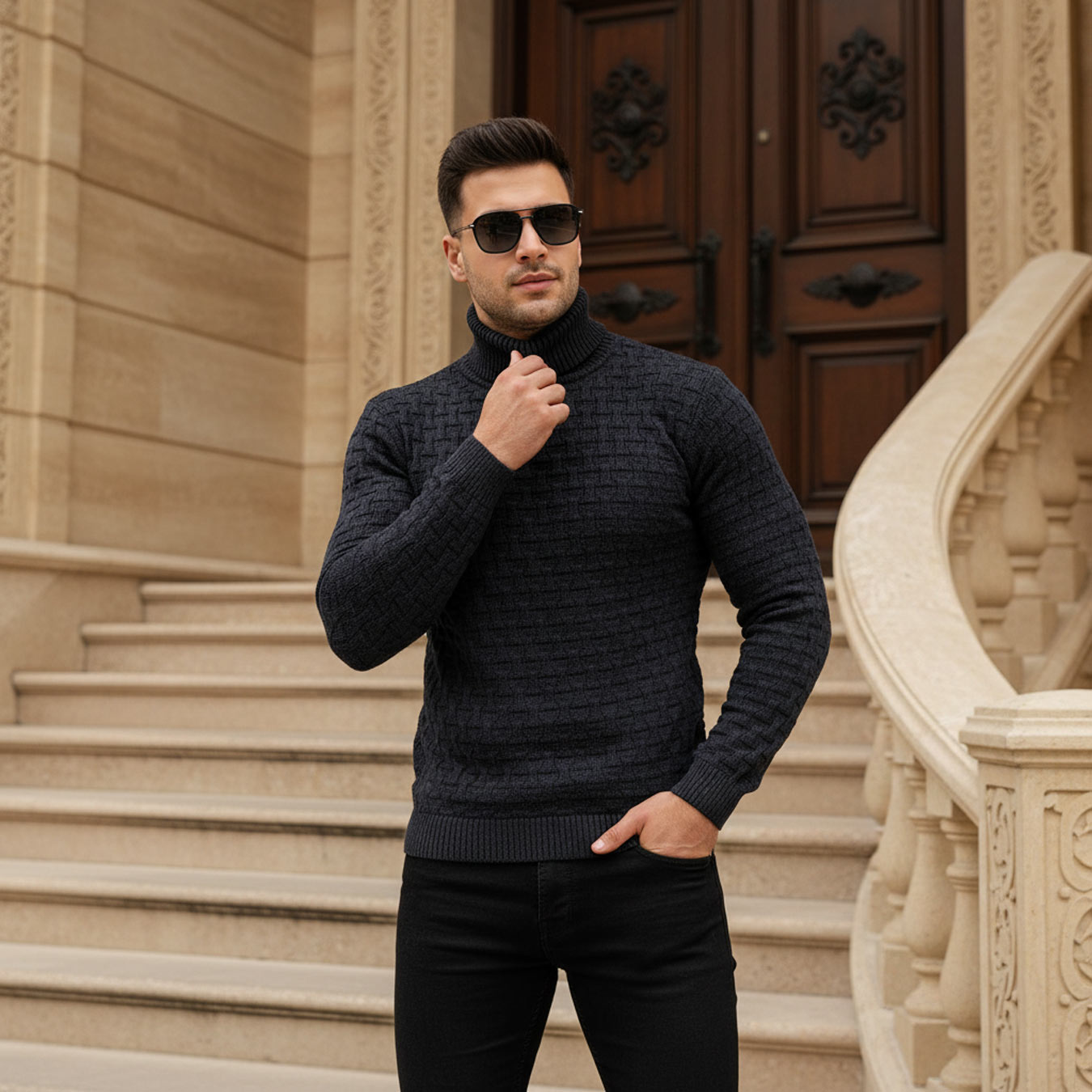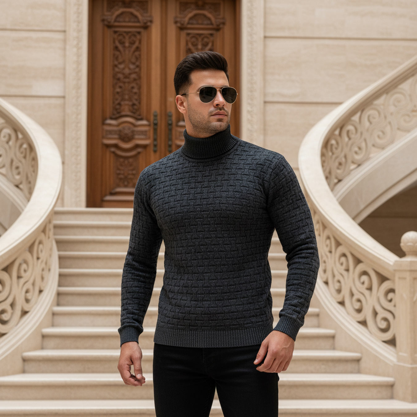 بافت یقه اسکی مردانه زغال سنگی طرحدار مدل 1990