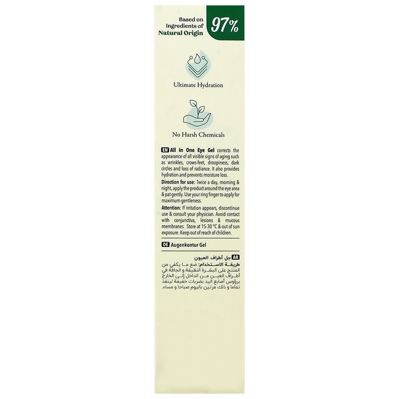 ین فراورده دارای مواد موثر و خصوصیاتی به شرح ذیل می باشد: بایوفیتکس (Biophytex) سبب استحکام بخشیدن به پوست و افزایش مقاومت آن و کاهش تیرگی زیر چشم ها می گردد. سدیم هیالورونات (Sodium Hyaluronate) نمک اسید هیالورونیک می باشد که به مقدار فراوان در ماتریکس بین سلولی پوست سالم موجود می باشد و با پر نمودن فواصل بین سلولی و حفظ آب موجود در این مکان ها از پوست مراقبت کرده و از خشک شدن آن جلوگیری می نماید و همچنین با کمک به حفظ رطوبت پوست سبب افزایش نرمی و بهبود انعطاف پذیری آن نیز می شود. کافئین (Caffeine) سبب رفع تیرگی، پف، ورم و التهاب گردیده و به ترمیم و بازسازی پوست اطراف چشم کمک شایانی می نماید. کوانزیم Q۱۰ یک ترکیب آنتی اکسیدان بسیار قوی دارای ساختار مشابه با ویتامین های E و K بوده و شامل یک حلقه Ubiquinone همراه با یک زنجیر ده کربنی می باشد. این ترکیب به صورت طبیعی در بدن افراد موجود بوده و با افزایش سن کاهش قابل ملاحظه ای می یابد. کوآنزیم Q۱۰ با محافظت از DNA کراتینوسیت ها در برابر آسیب های ناشی از اشعه UVA، کاهش عمق چروکهای پوستی و تقلیل زمان Turnover بافت اپتیلیوم، عوارض ناشی از photoaging را در پوست به طور چشمگیری از بین می برد. کلاژن هیدرولیز شده (Hydrolyzed Collagen) علاوه بر تقویت و افزایش استحکام پوست سبب تامین رطوبت مورد نیاز لایه شاخی پوست و افزایش الاستیسیته و طراوت آن می گردد. گلوکونات روی (Zinc Gluconate) با تسریع سنتز پروتئین های ضروری مانند کراتین، کلاژن و الاستین، سبب بهبود روند بازسازی سلولی می شود. این ماده همچنین با جلوگیری از اتصال ترکیبات آلرژی زا به سلول های مخاطی پوست، سبب کاهش حساسیت های پوستی نیز می گردد. اکتوین (Ectoin) یک ماده طبیعی محافظت کننده سلول های پوست در برابر عوامل مخرب و استرس های محیطی مانند آفتاب سوختگی، آلودگی ها، ترکیبات آلرژی زا و تابش های نور خورشید می باشد. اکتوین علاوه بر تسریع روند بازسازی سلول های پوستی و تقویت سیستم دفاعی طبیعی سلول، با حفاظت از سلول های موجود در اپیدرم سبب تقویت سد دفاعی طبیعی پوست شده و به ترمیم آن کمک شایانی می نماید. این ماده همچنین با اتصال به مولکول های آب و جلوگیری از حذف رطوبت طبیعی پوست، سبب افزایش نرمی و لطافت پوست و جلوگیری از آسیب پوست در برابر عوامل محیطی می شود. اسکوالان (Squalene) سبب افزایش رطوبت و انعطاف پذیری پوست می گردد. این ماده روغنی شفاف یکی از اجزای اصلی موجود در سبوم و فیلم هیدرولیپیدی پوست می باشد و با اثرات چندگانه خود به همراه پخش مناسب بر سطح پوست و جذب خوب توسط آن سبب نرم شدن پوست و جلوگیری از دفع آب می گردد. ویتامین C (Vitamin C) با کاهش سنتز ملانین در سلول های ملانوسیت و نیز کاهش مقادیر ملانین از پیش سنتز شده در این سلول ها، از ایجاد پیگمنتاسیون و ظهور لک های تیره در پوست جلوگیری می کند. همچنین با تسریع فرآیند سنتز کلاژن توسط سلول های فیبروبلاست سبب کاهش چین و چروک، افزایش انعطاف پذیری، نرمی و تقویت سد دفاعی طبیعی پوست شده و ظاهری جوان و شاداب به پوست می بخشد. ویتامین A (Vitamin A) عوارض پوستی همچون التهاب، قرمزی و پوسته ریزی را به میزان قابل توجهی کاهش داده و سبب تحریک سنتز کلاژن و الاستین در عمق اپیدرم شده و به حفظ الاستیسیته و رطوبت پوست کمک شایانی می نماید. این ویتامین با تحریک فرایند بازسازی پوستی، علاوه بر از بین بردن چروک های سطحی، سبب محو تدریجی و موثر چروک های عمیق نیز می گردد.