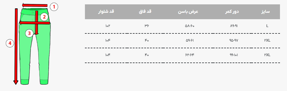 - تعداد جیب : دو جیب در جلوی شلوار, یک جیب در پشت شلوار